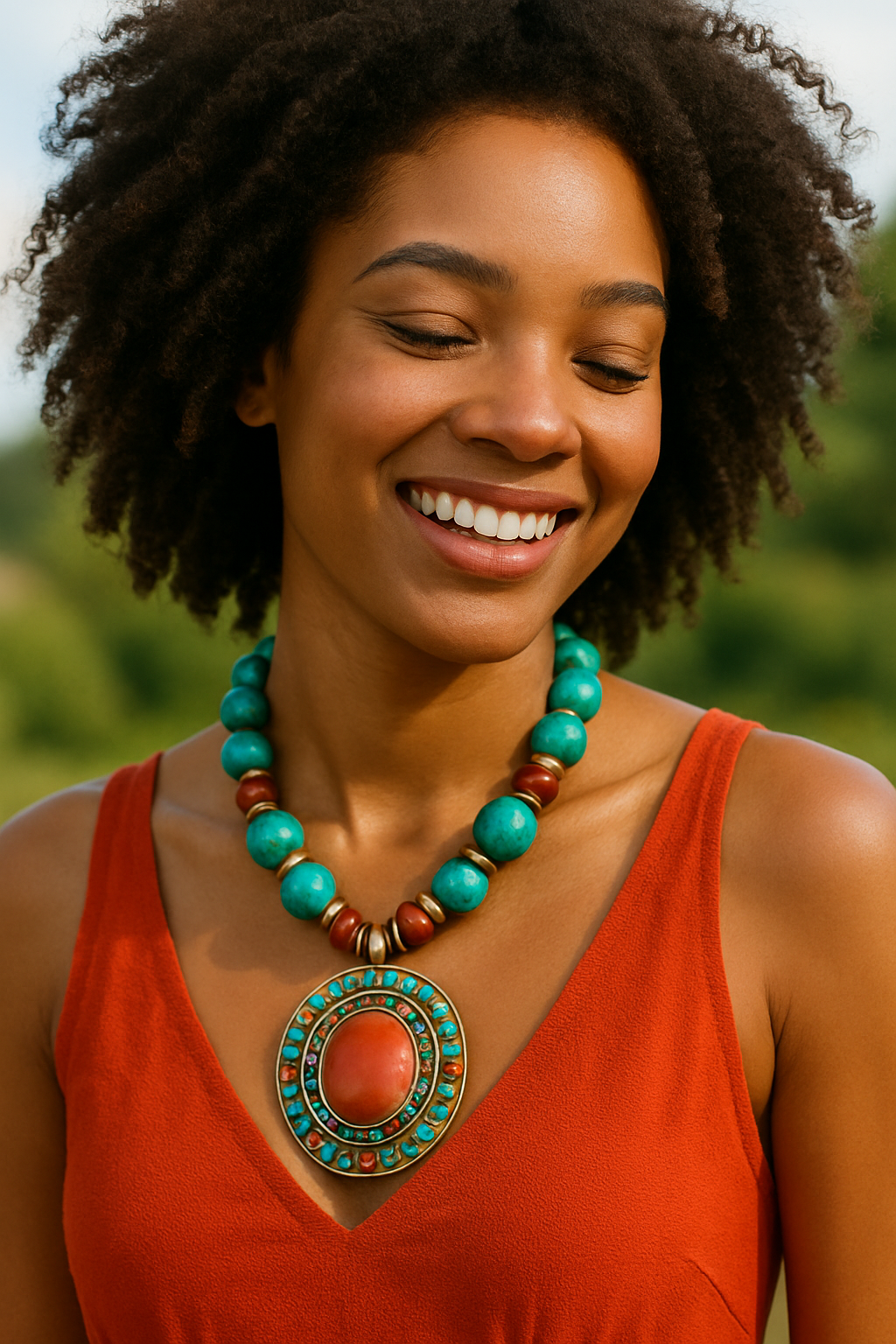 This bold bohemian necklace is a true statement piece, designed to turn heads and elevate any outfit with artistic flair. Featuring chunky turquoise beads interspersed with rich brass and earthy wood-toned accents, it draws the eye to its large, ornate focal pendant. The pendant showcases a vivid red-orange center stone surrounded by concentric rows of colorful beads in turquoise and coral hues, set in an antique gold-tone frame with intricate detailing. Perfect for pairing with a simple dress or flowing top, this necklace brings a vibrant, global-inspired charm that’s both earthy and elegant.
